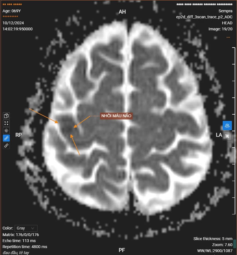 Bn nam 69 tuổi đến khám vì đau đầu, tê nửa người trái kết quả chụp MRI sọ não phát hiện hình ảnh vài ổ nhồi máu não cấp tính nhỏ thùy trán đỉnh phải.