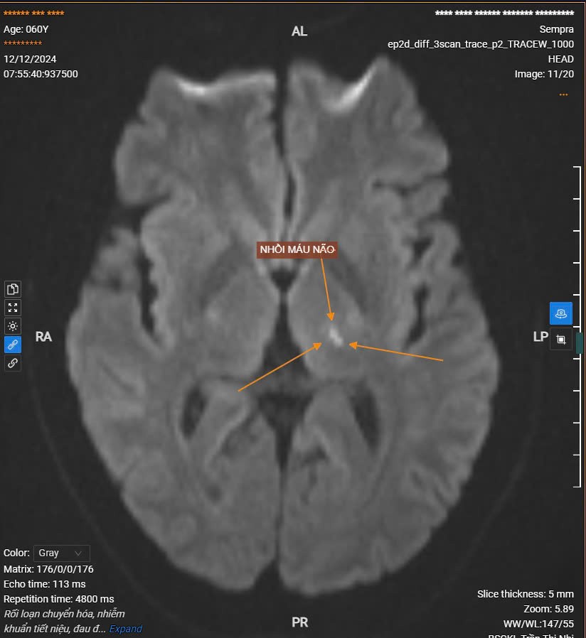 Bn nam 60 tuổi đến khám vì đau đầu, tê môi kết quả chụp MRI sọ não phát hiện hình ảnh ổ nhổi máu nhỏ bán cấp sớm vùng đồi thị trái