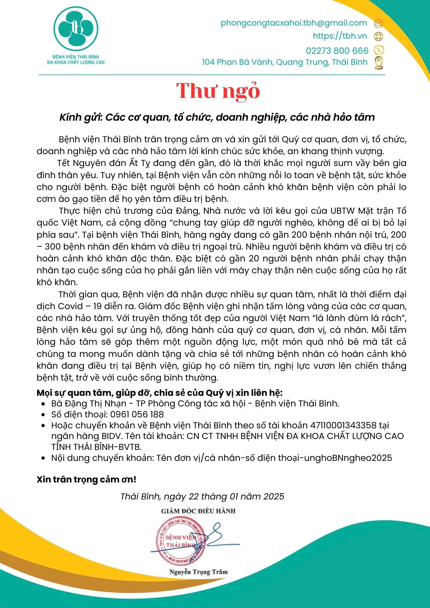 Thời gian qua, Bệnh viện đã nhận được nhiều sự quan tâm, nhất là thời điểm đại dịch Covid – 19 diễn ra. Giám đốc Bệnh viện ghi nhận tấm lòng vàng của các cơ quan, các nhà hảo tâm. Với truyền thống tốt đẹp của người Việt Nam “lá lành đùm lá rách”, Bệnh viện kêu gọi sự ủng hộ, đồng hành của quý cơ quan, đơn vị, cá nhân. Mỗi tấm lòng hảo tâm sẽ góp thêm một nguồn động lực, một món quà nhỏ bé mà tất cả chúng ta mong muốn dành tặng và chia sẻ tới những bệnh nhân có hoàn cảnh khó khăn đang điều trị tại Bệnh viện, giúp họ có niềm tin, nghị lực vươn lên chiến thắng bệnh tật, trở về với cuộc sống bình thường.